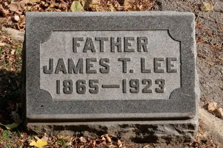 The cemetery deed, purchased by Cora M. Blocher notes the discrepancy between the name on the headstone which reads James T. Lee and the deed records the name Joseph Truman Lee.